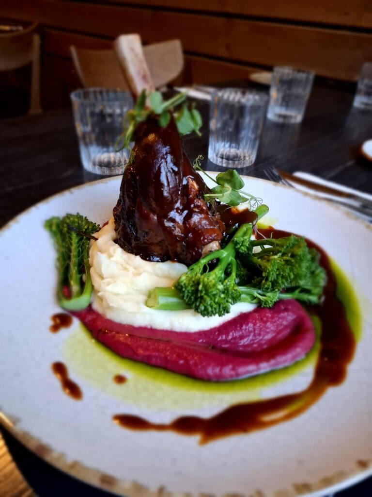 Icelandic Lamb Shank – With creamy potato purée enriched with butter and cream, vibrant red cabbage purée and tender broccolini served with red wine and honey glaze.
