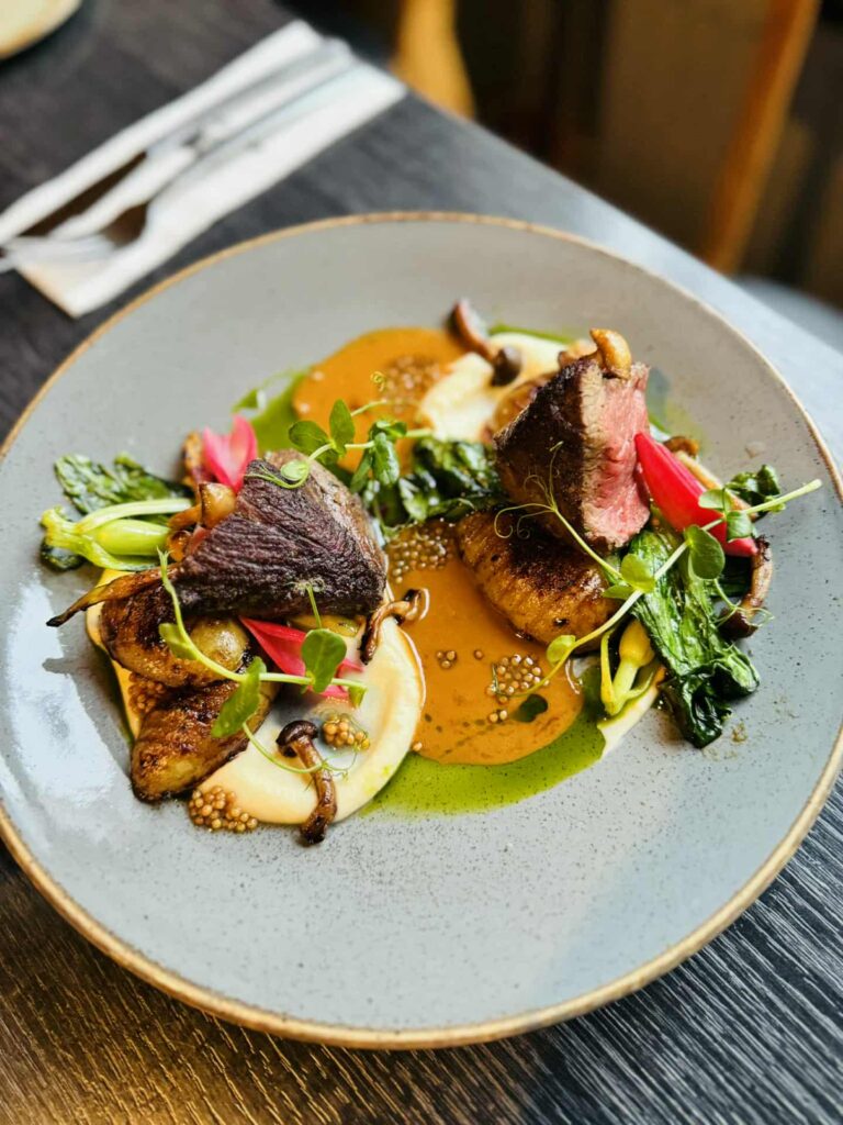 Nautalund – Með rjómalöguðu sellerí- og vanillumauki, hasselback kartöflum, shimeji sveppum og pak choy borin fram með dillolíu og trufflu- og smjörsósu ásamt pikkluðu meðlæti.