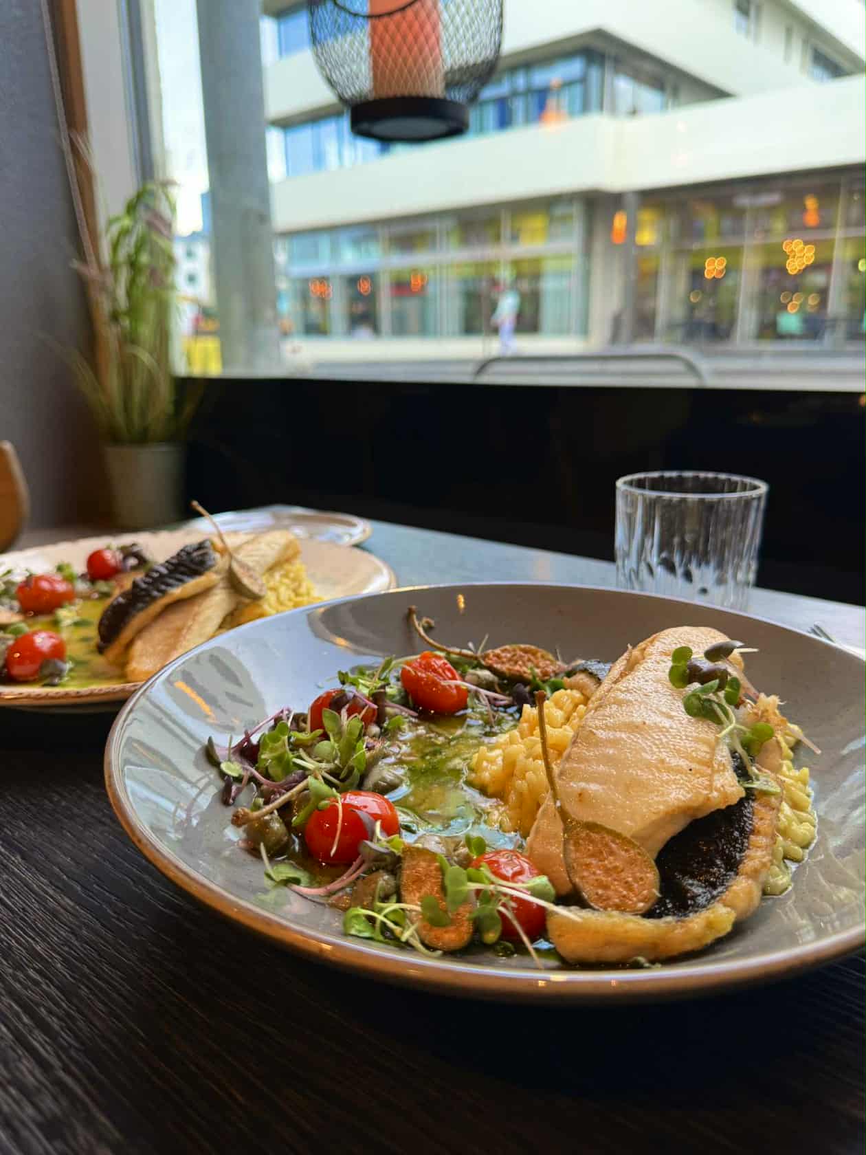 Pan-seared plaice – With creamy lemon risotto, warm olive emulsion with capers served with confit cherry tomatoes and fresh coriander.