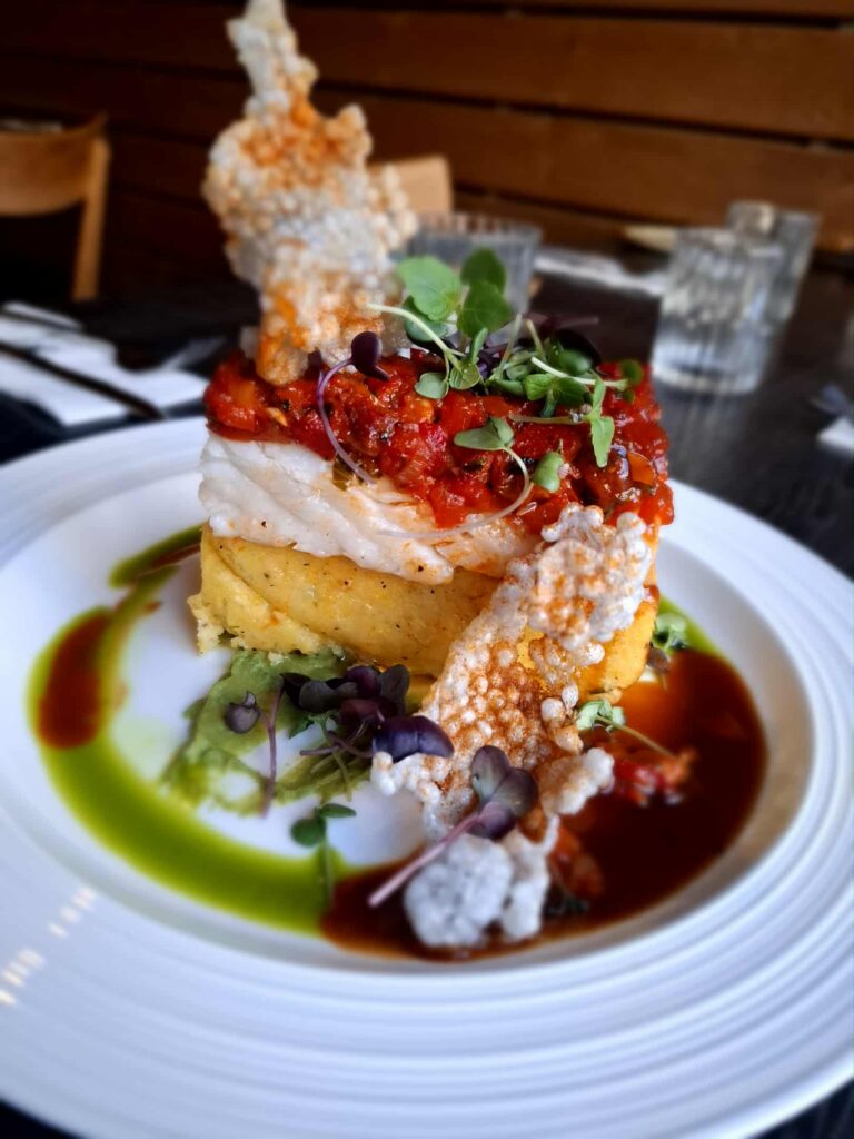 Ofnbakaður þorskhnakki – Með papriku- og tómatsalsa, sítrónu- og timían polentu, grænbauna- og basil mauki ásamt stökkum tapíókaflögum og mandarínugljáa.
