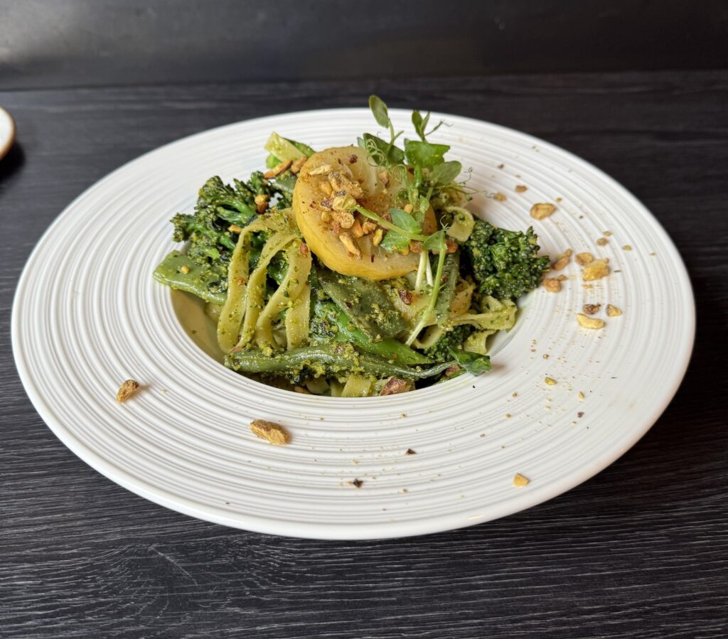 Vegan tagliatelle – With creamy pistachio pesto, green vegetables & pickled lemon.